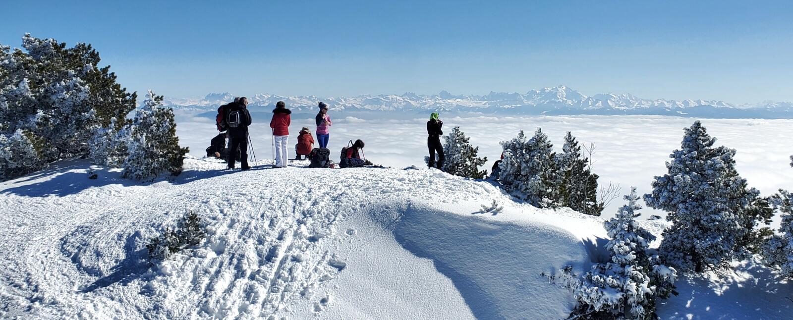 02/03 : Dimanche, premier départ du gîte en raquettes pour une montée de 860 m, une douzaine de kilomètres, le Crêt de la neige et le Grand Crêt (1720 m et 1702 m). La neige est bien là-haut. Une belle mer de nuage est tapie au pieds de la superbe chaîne du maître Mont Blanc. HOHOHO !!!