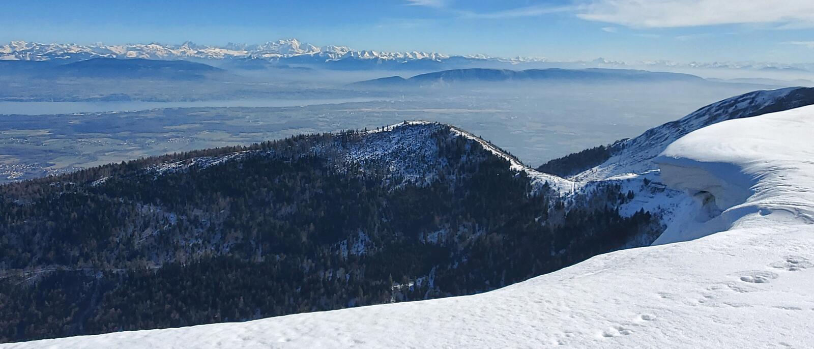 07/03 : Pour finir en beauté, Christian et Bernard nous proposent une virée d'une douzaine de kilomètres en raquettes passant par le crêt de Neige pour atteindre le Reculet qu'on convoitait. Aucune lassitude devant ce panorama, vu de plus au sud aujourd'hui. Quelques chamois broutent déjà l'herbe dans des espaces sans neige. En cette saison, en 2025, la neige a manqué d'épaisseur ici aussi.